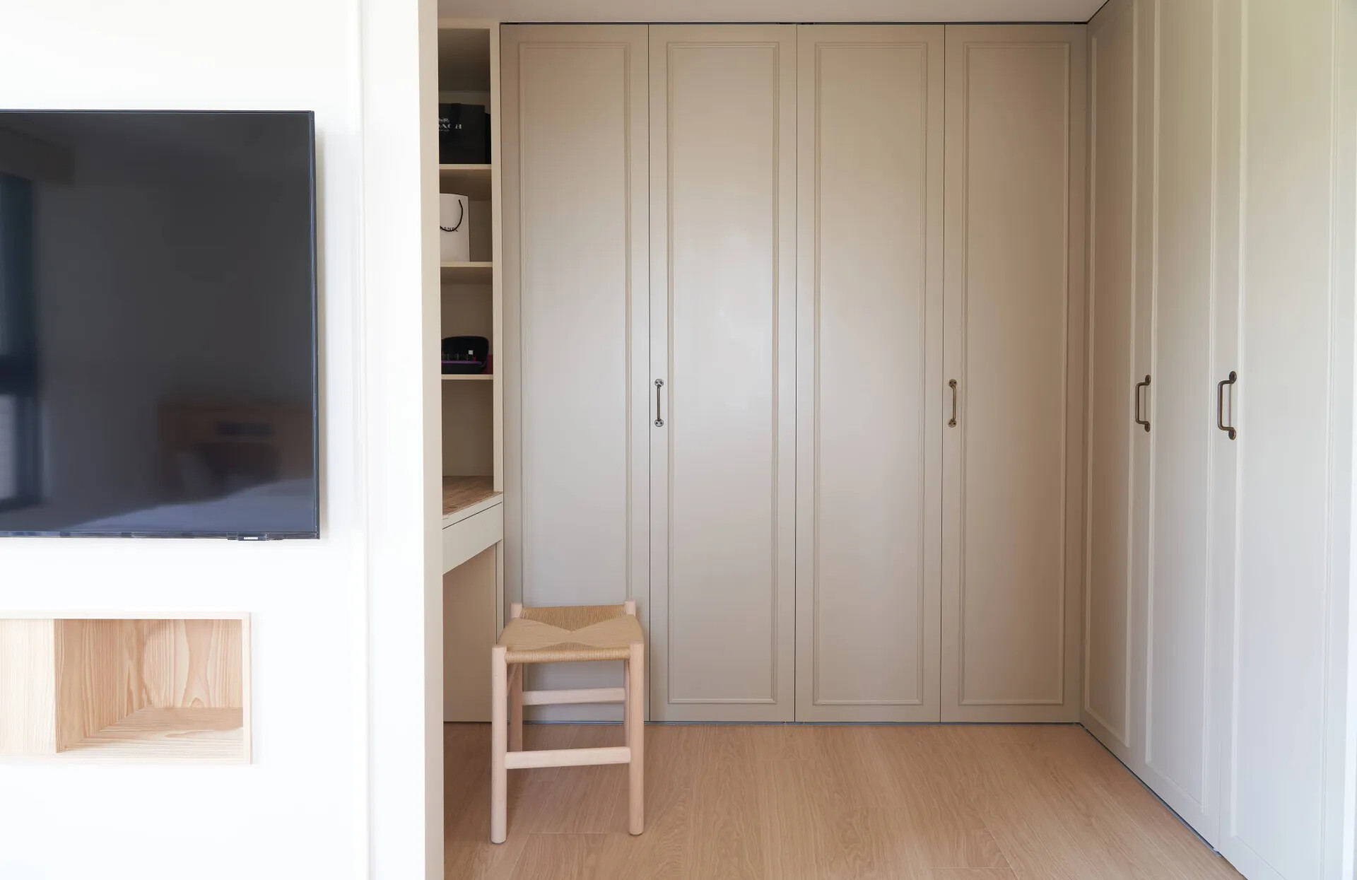 延續日系飯店宅,輕量化漂浮床邊櫃、衣帽間無區隔折門可自由運用收納,彈性化屋主收納安排。