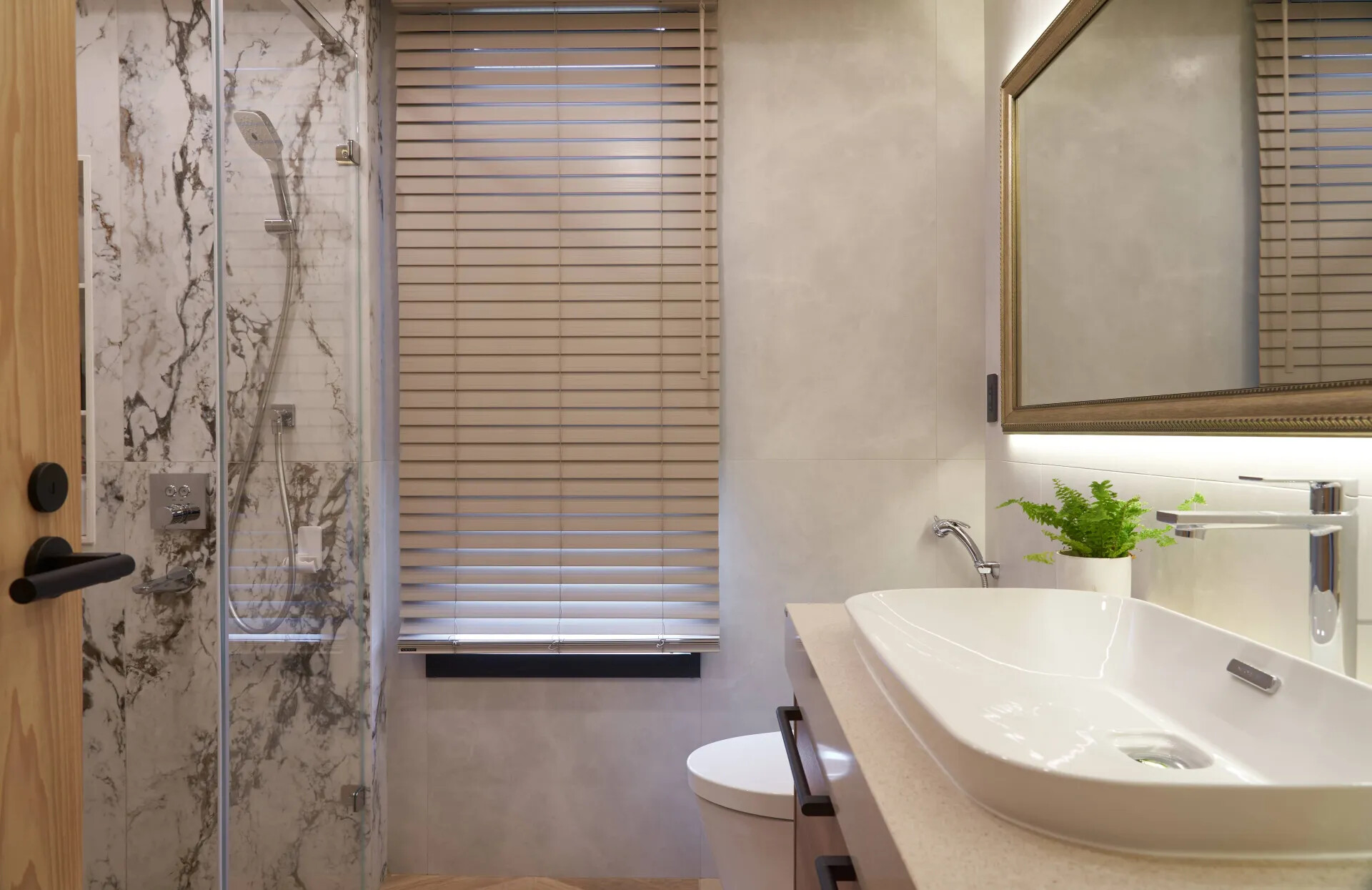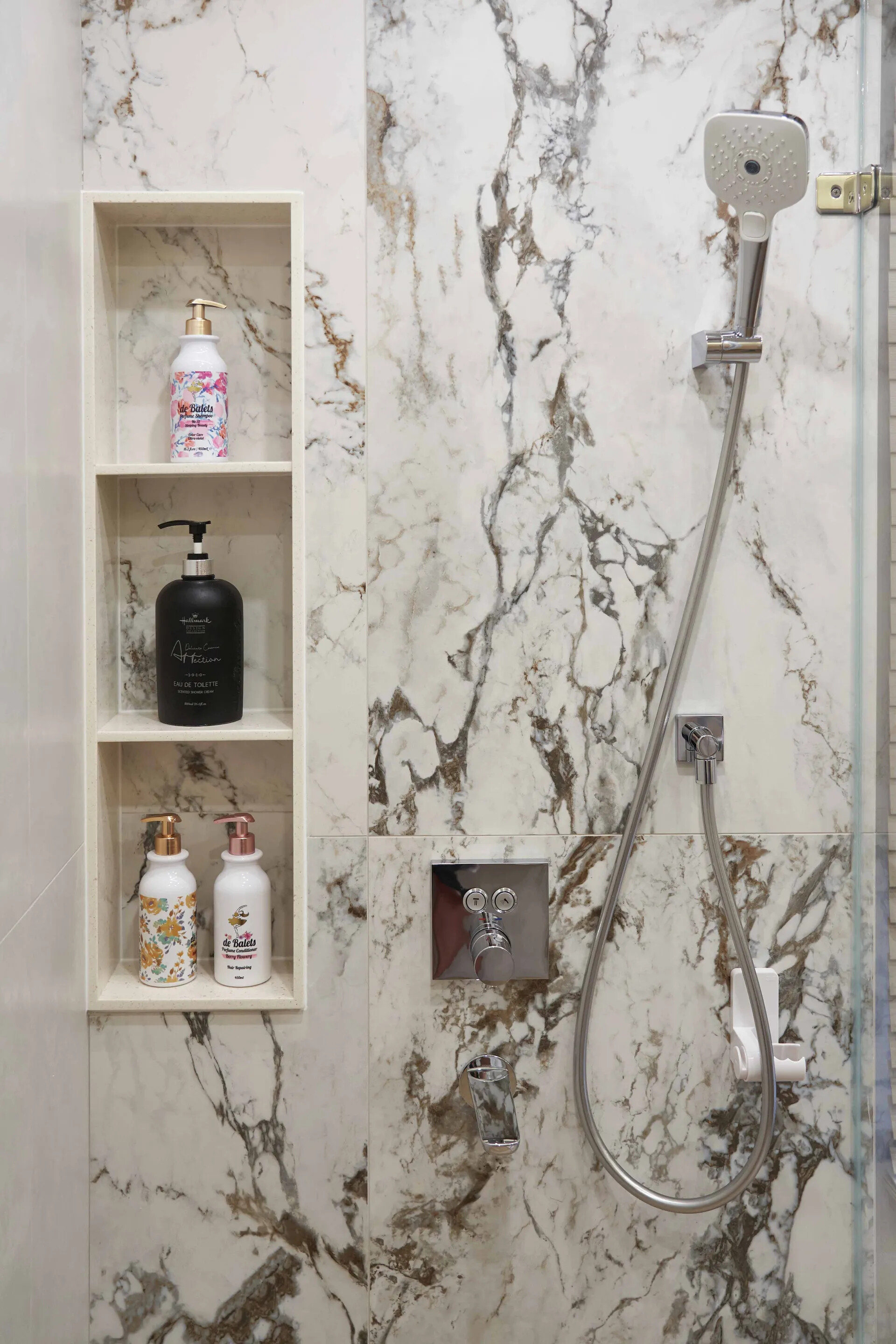 進口仿石材大板磚,搭配內崁壁龕收納。