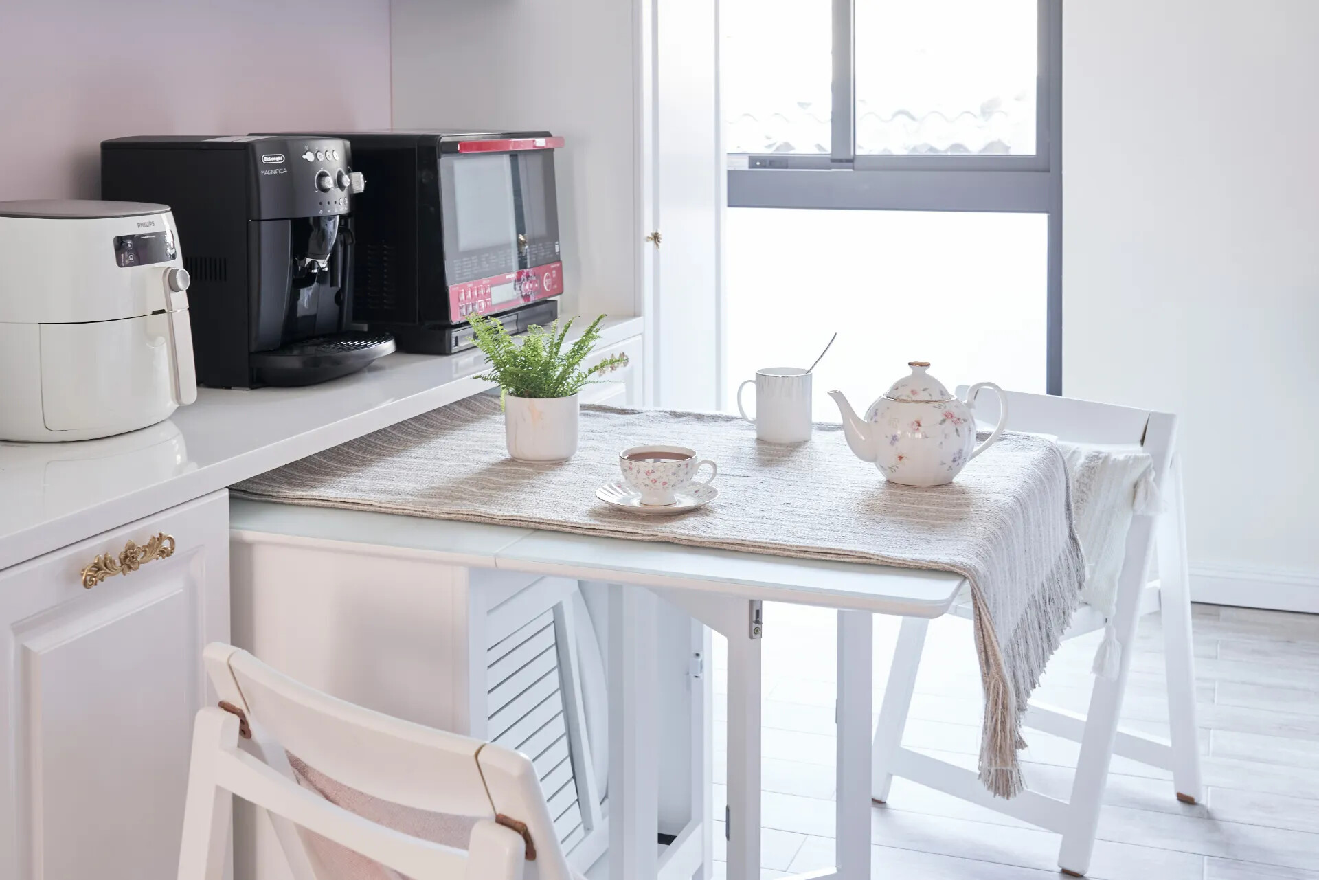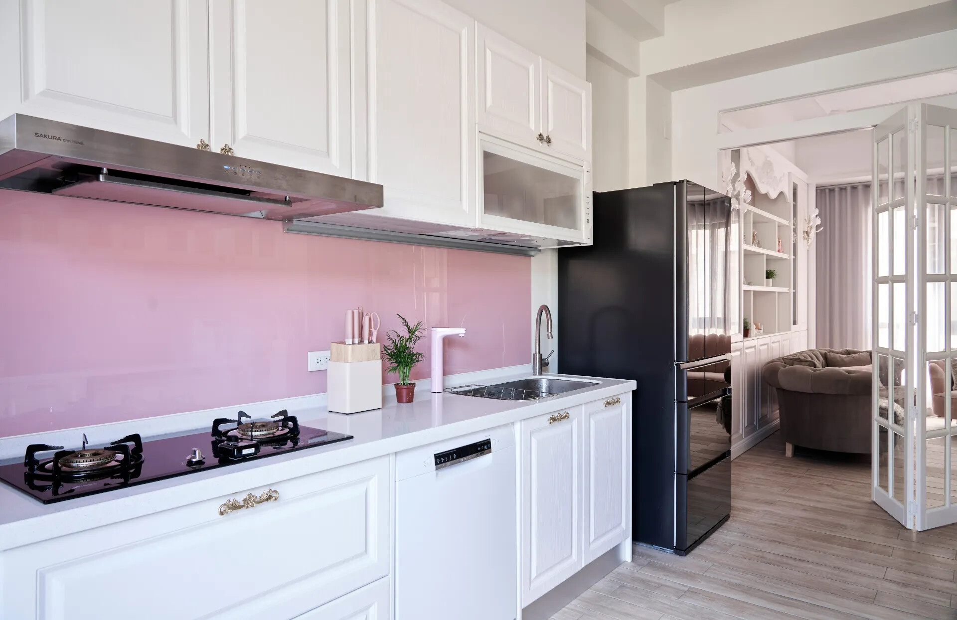 依循全屋設計主軸,廚具工作區的烤漆玻璃大膽嘗試使用櫻花粉,而櫃體選用歐式造型的門片與客廳的設計做呼應,白色的面板與檯面,搭配櫻花粉色烤漆玻璃成為空間的亮點。