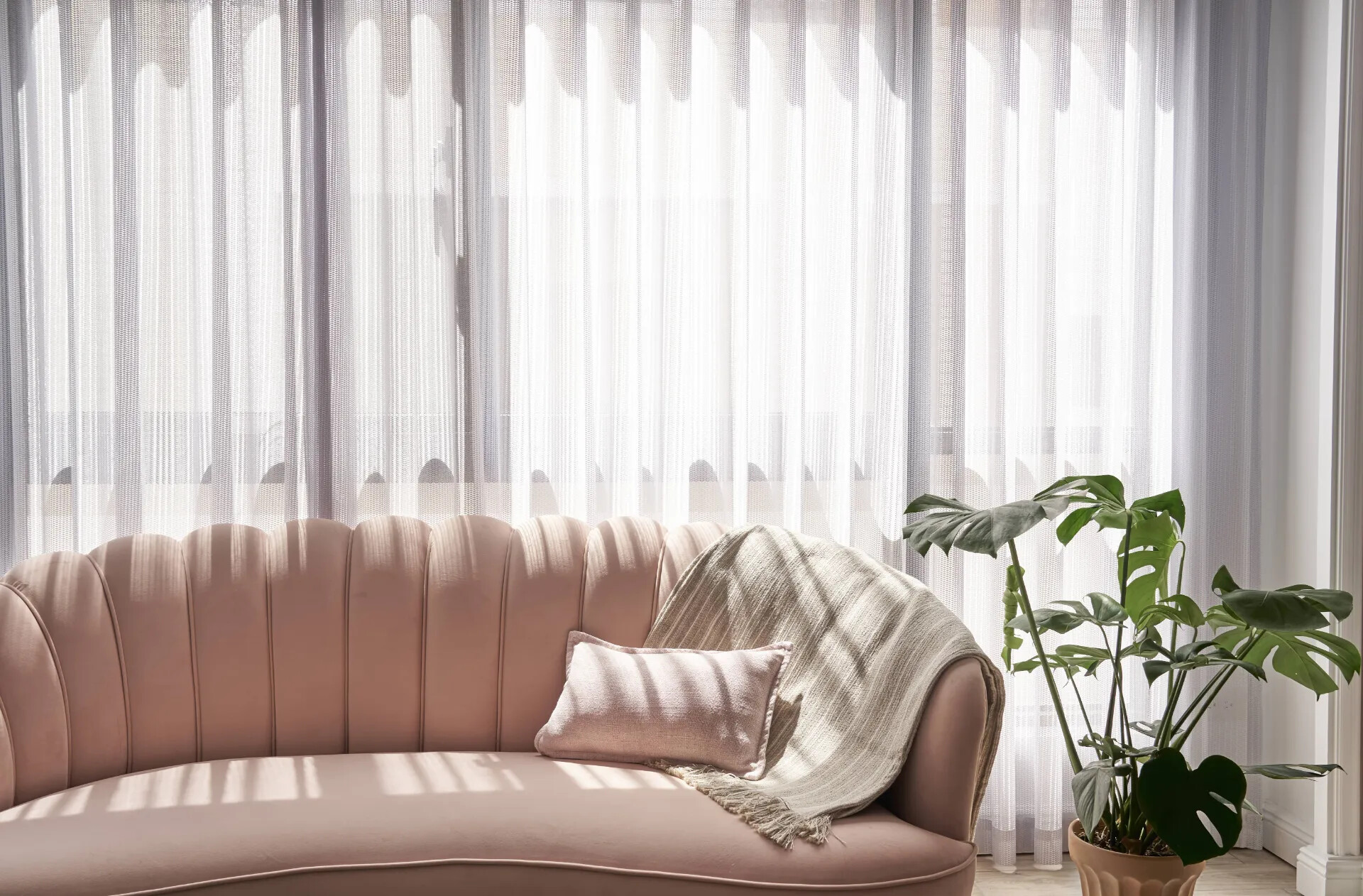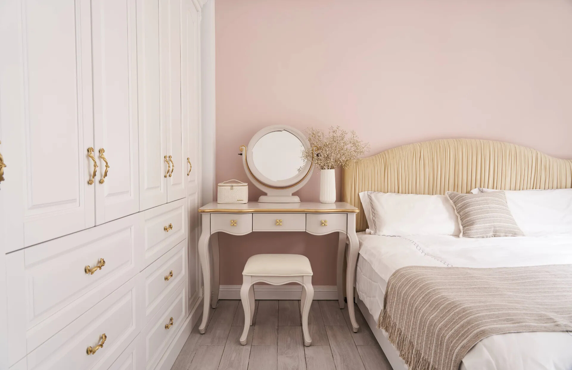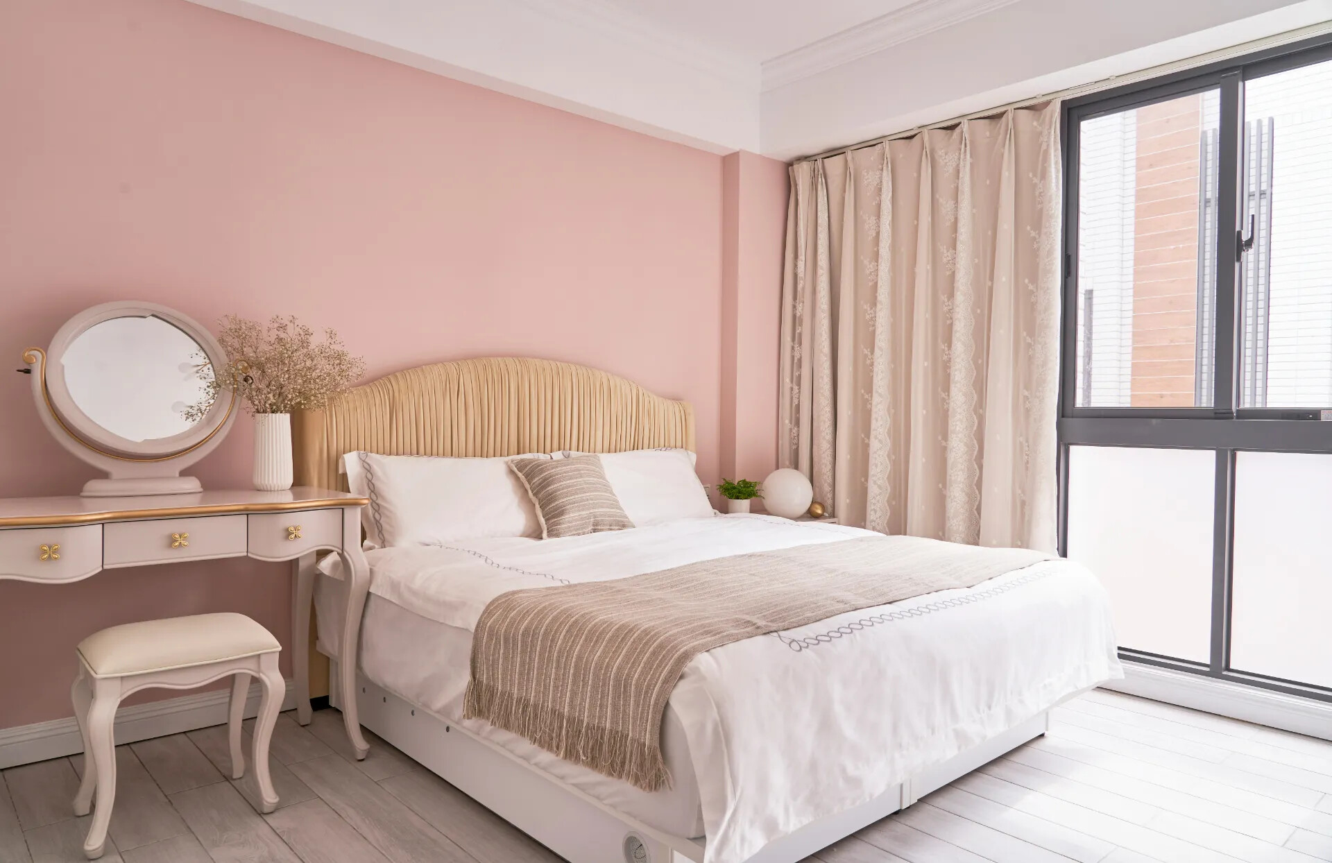 延續著客廳的溫柔粉,來到主臥我們選擇帶點煙燻粉的色系,就像走進一個充滿夢幻和幸福的公主城堡。