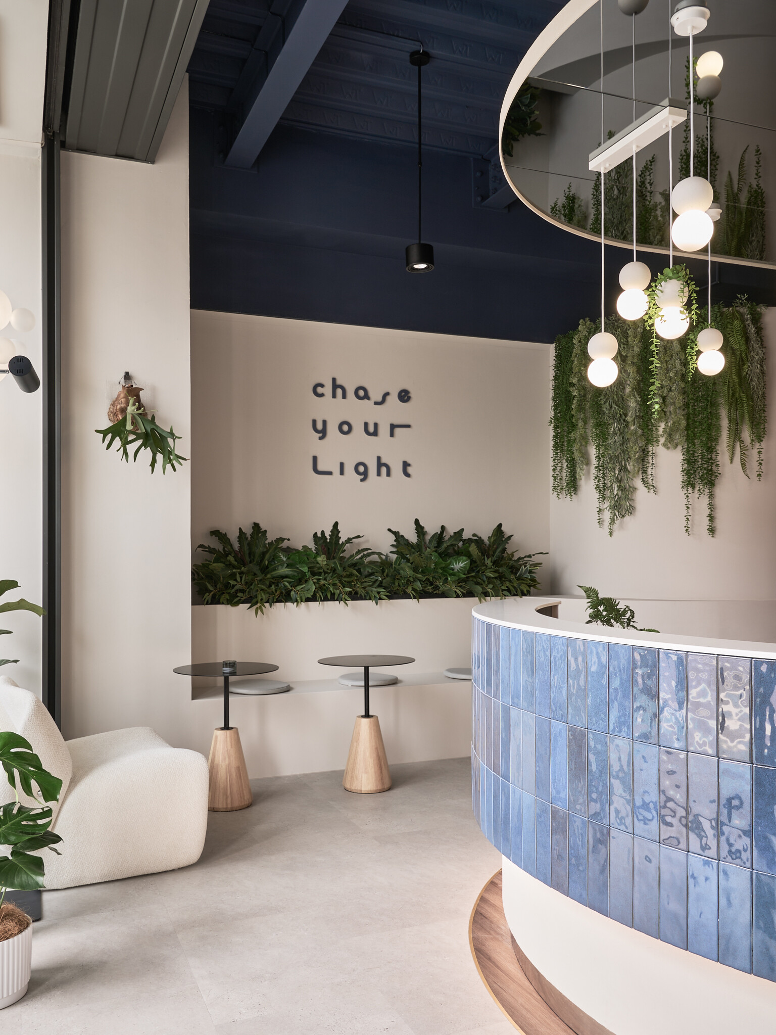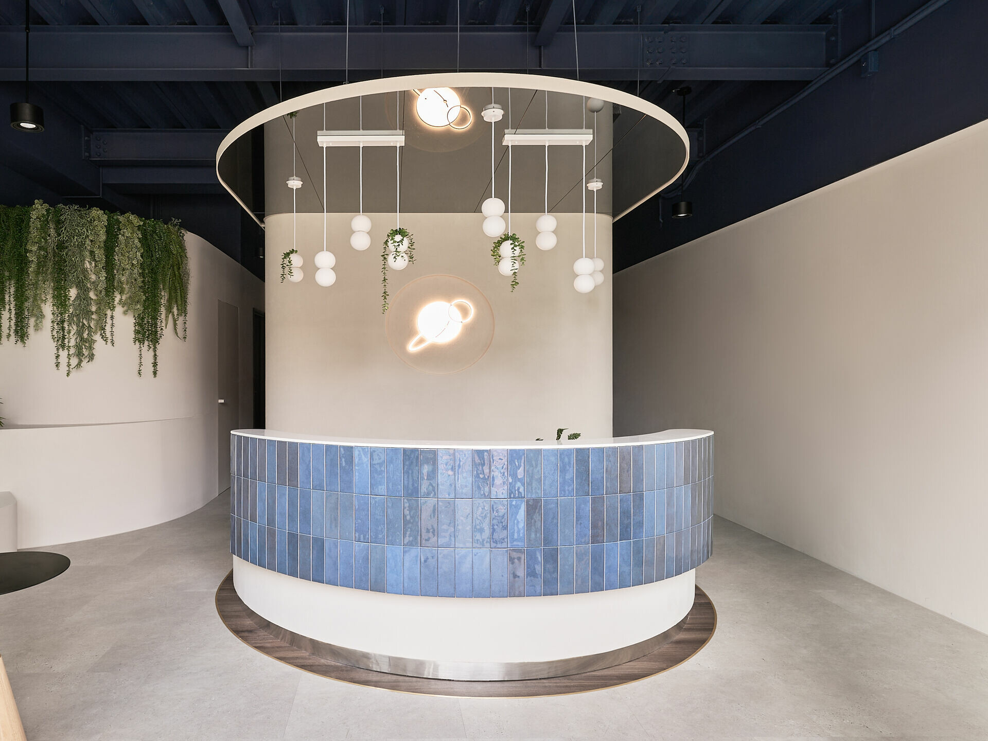 櫃台採用色彩變化繁複的窯變磚,每塊顏色皆不同,同時顯現出肌膚護理並不只針對單一客群,而是所有的人都能藉此讓自己變得更有自信。